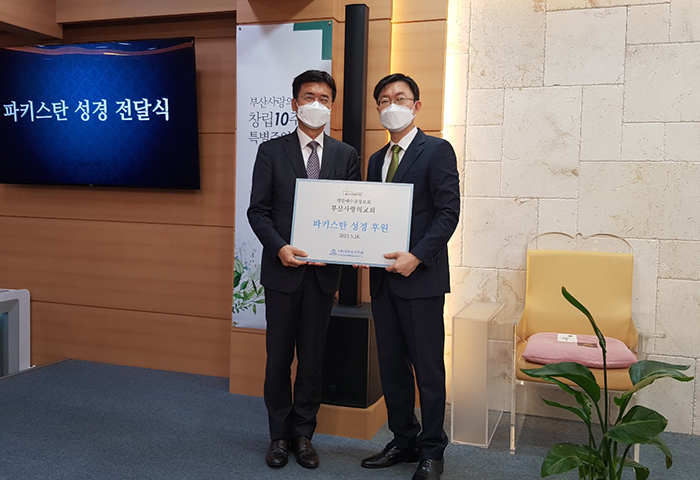 5월 16일, 부산사랑의교회(염부섭 목사)에서 파키스탄에 우루두어 성경 2,786부를 지원하기 위한 전달식을 가졌습니다. 부산사랑의교회는 핍박 가운데 신앙을 지키는 파키스탄 사람들이 말씀을 통해 믿음을 굳게 세우고 복음이 전해지기를 소망하며 헌금을 전달하였습니다.