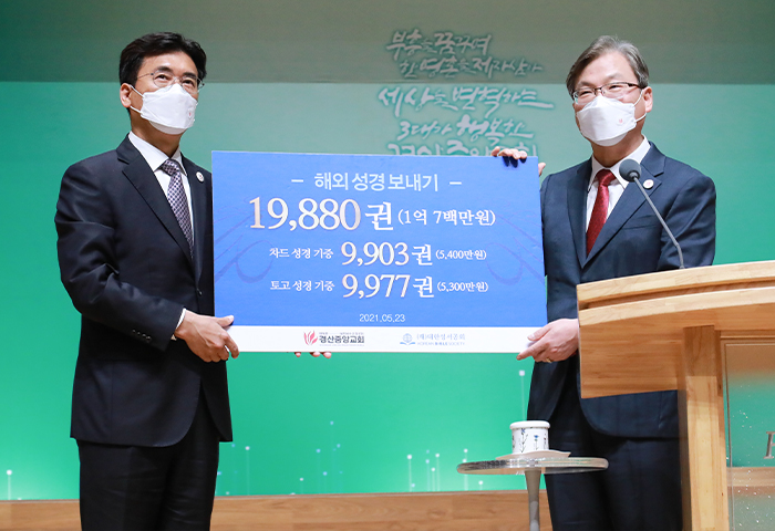 5월 23일, 경산중앙교회(김종원 목사)에서 아프리카 차드와 토고에 불어 성경 19,880부를 지원하기 위한 전달식을 가졌습니다. 경산중앙교회는 차드와 토고가 어려운 경제적 환경과 타 종교의 핍박 속에서도 말씀을 통해 위로와 용기를 얻기를 소망하며 헌금을 전달하였습니다.