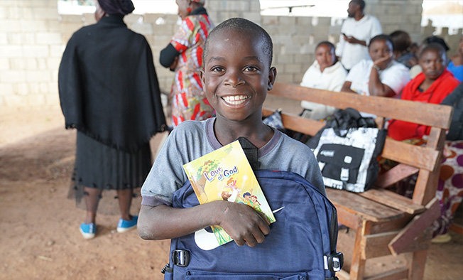 어린이 그림 성경을 선물 받고 미소 짓는 잠비아 자세일 아카데미(Jasail Academy) 어린이
