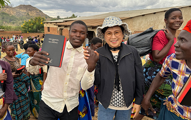 성경을 선물 받고 기뻐하는 말라위 성도와 김영례 권사(대한성서공회 홍보대사)