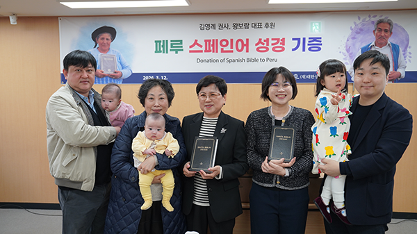 2026년 3월 12일, 본 공회(이사장 이선균 목사)에서는 김영례 권사(대한성서공회 홍보대사), 왕보람 대표의 후원으로 페루에 <스페인어 성경> 14,800부를 보내는 기증 예식을 가졌습니다. 김영례 권사 가정은 故왕기일 장로의 유지를 따라 9년째 해외 성경 보내기를 위해 헌신하고 있으며, 금년 추도 11주기를 맞이하는 가운데 페루까지 11개 나라에 총 71,052부의 성경을 후원하였습니다.