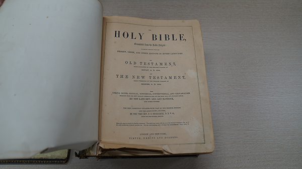 함께 기증된 『헤이독 성경』은 라틴어 불가타(Vulgate) 성경을 영어로 번역한 ‘두에-랭스 성경(Douay-Rheims Bible)’의 주석판이다. 1582년 신약(랭스)과 1609년 구약(두에)이 각각 처음 출판된 이후 19세기에 조지 레오 헤이독(George Leo Haydock)의 방대한 주석이 더해져 완성된 판본으로, 후센베스(F. C. Husenbeth)가 주석을 요약·교정하였습니다.