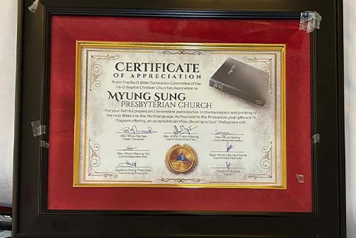 <파오 부족이 후원교회인 명성교회에 전달한 감사패>