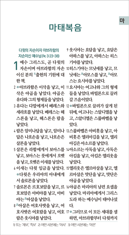 140여 년 전에 시작된 한글 성경의 번역과 보급은, 한국 교회의 부흥과 발전을 이끌었을 뿐 아니라 한글 문명사의 전환점이 되었습니다. 성경의 번역과 보급을 통하여 전해진 복음의 메시지는 한국 교회의 예배와 개인의 신앙생활의 중심이 되었습니다. 그리고 시대가 변함에 따라 성경이 새롭게 번역되고 개정되면서 믿음의 유산으로 이어졌습니다. 현재 한국 교회는 『성경전서 개역개정판』(1998년)을 예배용 성경으로 사용하고 있습니다. 이 성경은 최초의 한글 완역 성경인 『셩경젼셔』(1911년)에서 1938년과 1961년, 1998년에 크게 세 차례 개정되어 지금에 이르고 있습니다. 앞으로도 오랫동안 강단에서 쓰일 수 있도록 이 성경의 번역 전통은 계속 이어져 나갈 것입니다. 21세기, 현대 사회가 디지털 매체를 기반으로 급속하게 변화함에 따라 젊은이들이 사용하는 언어와 성경 읽기 양상에 큰 변화가 일어나고 있습니다. 이에 대한성서공회는, 젊은이들이 성경을 더 쉽고 정확하게 이해하고 자신의 삶 속에 적용할 수 있도록 새로운 번역 성경을 준비하게 되었습니다. 『새한글성경』은 그 책 제목 ‘새한글’에서도 알 수 있듯이 ‘한국어 어법에 어긋나지 않는 한 새롭고 참신한 용어와 방식’을 사용하면서도, ‘성경’으로서 ‘원문’에 최대한 충실한 번역이 되도록 하였습니다. 젊은이들이 사용하는 어휘와 쉽고 간결한 표현을 사용하여 번역하되, 원문의 문법적 구조뿐 아니라 어원적 특성과 어순의 강조점까지 최대한 반영하여 원문에 가깝게 번역하였습니다. 그리하여 강단용 성경인 『성경전서 개역개정판』이나 다른 기존 역본들과 함께 읽을 때에 원문의 풍부한 의미와 분위기를 좀 더 잘 이해할 수 있도록 하였습니다. 이러한 『새한글성경』의 번역 작업은 2011년 9월 대한성서공회 이사회의 결정으로 시작되었습니다. 그해 12월 27일부터 ‘성경번역연구위원회’가 조직되어 번역 원칙을 연구하기 시작하였습니다. 1년 동안의 번역 원칙 연구를 거쳐, 2012년 12월 14일부터는 각 교단의 성서학자 36명이 함께 본문을 번역하고 검토하였고, 국어학자 3명이 이를 읽으면서 본문을 다듬었습니다. 2021년 11월에는 『새한글성경 신약과 시편』을 먼저 발행하여 독자들의 의견을 받았습니다. 그 의견들을 원문에 비추어 검토하여 2024년 12월에 발간한 『새한글성경』에서는 이를 최대한 반영하였고, 신구약에 공통으로 나오는 주요 용어들과 신약에 인용된 구약의 번역을 면밀히 살펴서 가능한 한 통일성을 유지하도록 하였습니다. 그러나 각 책의 문맥과 문학적 특성, 구약의 히브리어와 신약의 그리스어 차이를 고려하여, 단순하게 일치를 시키지는 않았습니다. 이번에 발간하는 『새한글성경 신약과 시편』은 2021년에 발간한 『새한글성경 신약과 시편』과 달리 2024년에 발간한 『새한글성경』에 있는 신약과 시편 본문을 가져와 편집하였습니다. 『새한글성경』의 번역 특징은 대략 다음과 같습니다. 1. 원문의 긴 문장은 짧은 여러 문장으로 나누어 번역하고, 가능하면 한 문장이 50자 내외 16어절 정도를 넘지 않게 하여, 디지털 매체로 읽기에 적합하도록 한다. 2. 원문의 문학 갈래(장르)에 따른 특징을 최대한 살려 번역하여, 원문의 다채로운 문체가 번역문에서도 드러나게 한다. 특히 시는 그 의미와 운율이 살아날 수 있도록 원문의 형식적 특성이 최대한 드러나는 번역을 한다. 또 시편에서는 다른 책과는 달리 ‘여호와께서’가 아닌 ‘여호와가’를 주격 조사로 써서 찬양하는 사람, 기도하는 사람 등과 하나님의 친밀감이 드러나도록 한다. 3. 옛 문체의 종결어미인 ‘-느니라’를 쓰지 않고, 현대 한국어 종결어미인 ‘-이다/-하다’를 쓰되, 필요한 경우에는 ‘-입니다/-합니다’를 쓴다. 4. 대화문은 상황에 맞는 입말로 옮기며, 한국어 어법에 맞는 높임법을 사용한다. 대중에게 하시는 예수님의 말씀은 격식체인 ‘하십시오체’를 사용하며, 기도나 개인에게 하시는 말씀은 좀 더 친밀한 문체인 ‘해요체’를 사용한다. 시편에서는 하나님께 아뢰는 기도, 혼잣말, 다른 사람에게 하는 말에 각각 알맞도록 종결어미를 달리한다. 5. 원문에서 어순 변형 등을 통해 문장의 일부를 강조한 경우에는 번역에서도 이를 최대한 드러내도록 한다. 6. 과거에 통용되었으나 현재 널리 사용되지 않는 낱말은 가능한 한 현재 젊은이들이 사용하는 새로운 낱말과 표현을 찾아서 번역하고, 필요한 경우에 전통 번역은 괄호 안에 병기하거나 각주에 밝힌다. 7. 언어의 차이나 문화의 차이로 의미 전달에 어려움이 있는 본문은 뜻을 이해할 수 있게 번역하되, 원문 그대로의 표현은 각주에 밝힌다. 8. 원문의 비유법, 완곡어법은 뜻을 알 수 있게 옮기고, 원문 그대로의 표현은 각주에 밝힌다. 9. 여성이나 장애인이나 환자나 특정 사회 계층의 사람을 비하하는 느낌을 주는 낱말이나 표현은 문맥에서 꼭 필요로 하는 경우가 아니면 공식적으로 통용되는 말로 번역한다. 10. 도량형(무게, 길이, 부피 등)과 화폐 단위, 시간과 요일을 다매체 시대의 한국어 사용자가 이해할 수 있는 익숙한 것으로 바꾸어 적는다. 그러나 달란트, 데나리