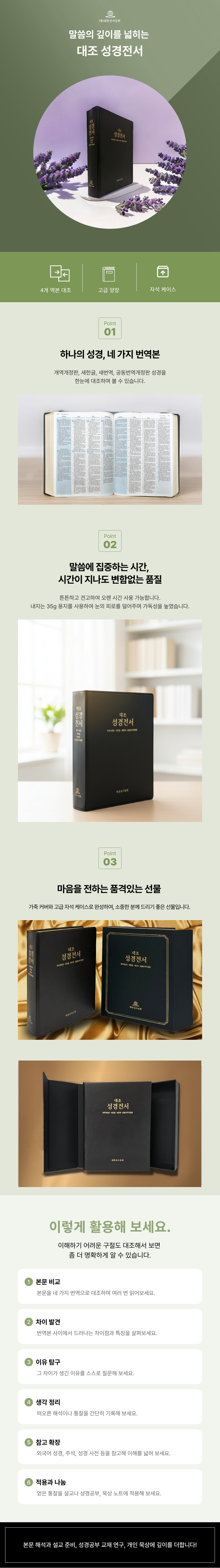 - 한권으로 여러 역본을 대조하여 볼 수 있습니다.